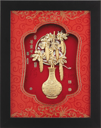 外徑27*34CM本產品採用999純金,將高貴的純金箔經創意構思、精心設計、確定整體效果,再運用傳統塑模,剪、刻、捏、膠等不同手法,經過繁複的工序,嚴謹製作而成。在您欣賞作品之餘亦能體驗博大精深的民族藝術。立體金箔畫不僅有很有藝術價值和觀賞價值,更是您自用送禮饋贈的最佳選擇。
